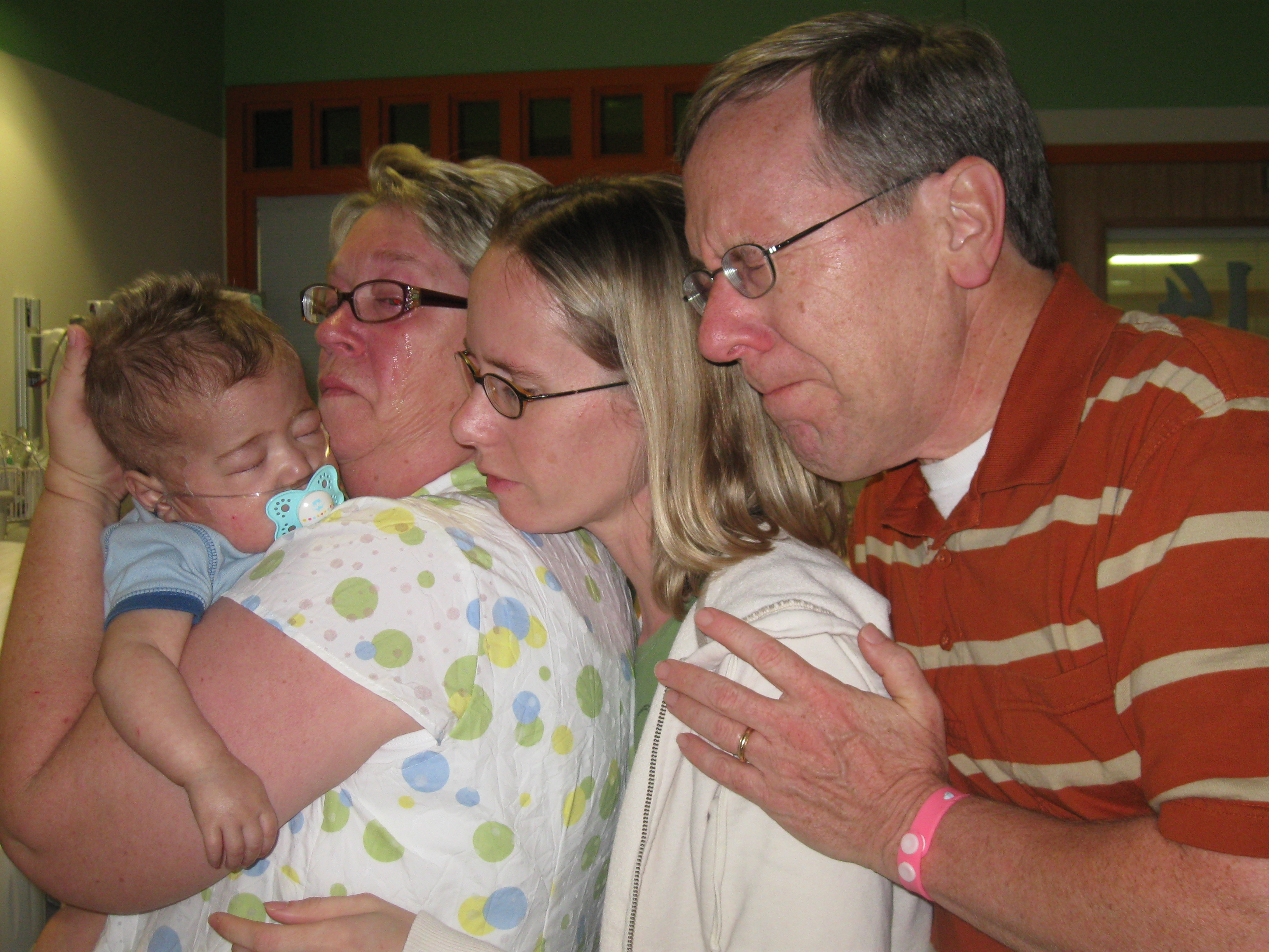 (August 2, 2015, this Sunday, will mark seven years since our grandson Sully, fifteen months old, died. For thirteen months he battled leukemia. His illness, his suffering, his death, challenged my faith as it had never been challenged. I first wrote the following post as the last in a series on forgiveness. I titled it “Forgiving God?” I repost it in memory of Sully. As when first posted, so now, the purpose is first, to help us understand and be as patient as God with the grief, anger, and doubts of those who are going through a darkness in their lives we have not experienced. Second, I speak especially to those who have known the depths of the blackest darkness of tragedy, suffering, and loss in their lives. Who struggle with God, his seeming silence, and the contradiction of our perception of God and his reality. With hesitation, humility, and grief, I share the picture of Sully, my wife, Sully’s mother, our daughter, and myself. This was the day before Sully died. I share this picture for you to understand I write these words from a heart that has known the depths of darkness, from a heart that has been angry with God and has struggled with doubt. I pray my words will help if you find yourself in the darkness.)
